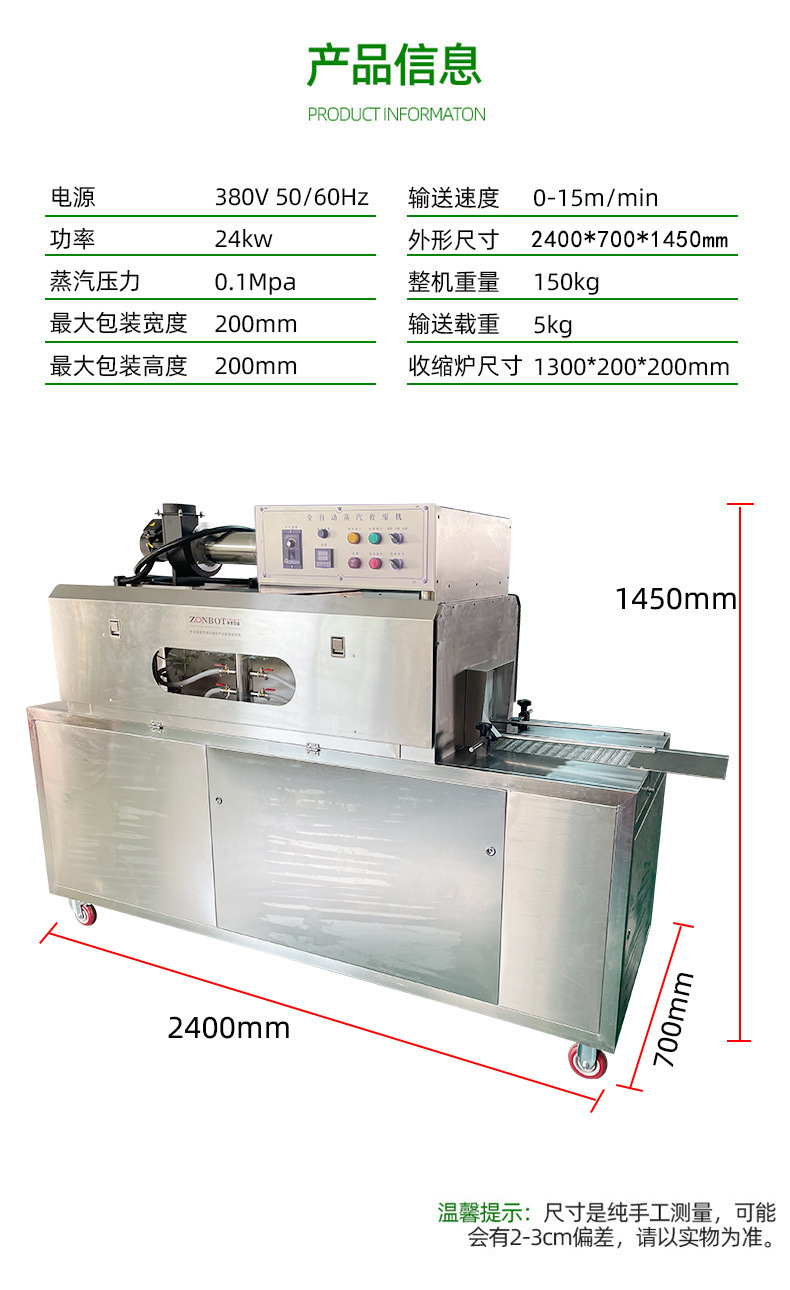 - 高效封裝:利用蒸汽的熱傳導性快速軟化膜材,收縮時間較傳統電加熱縮短 30%~50%;