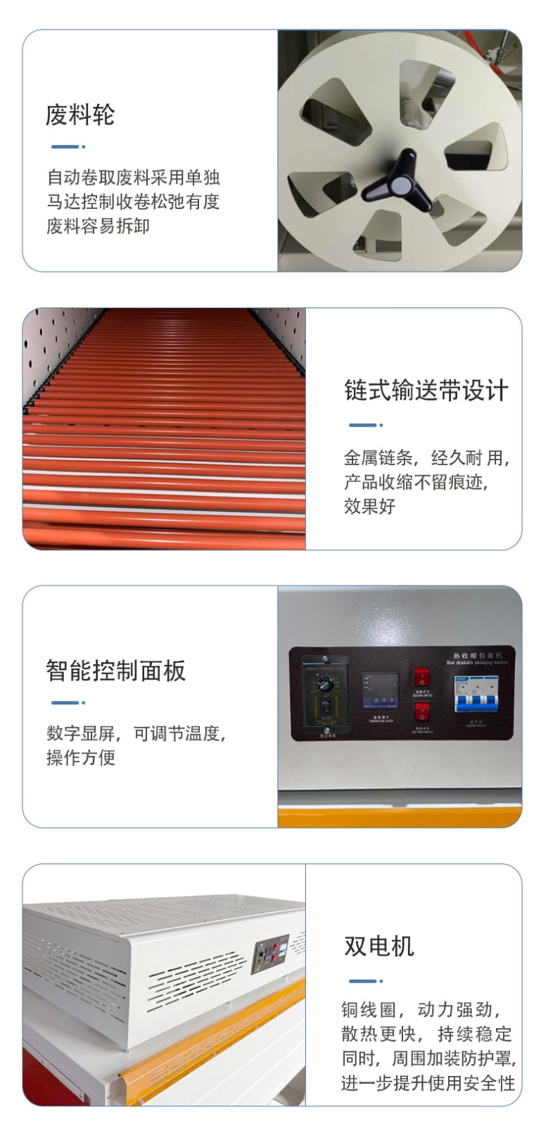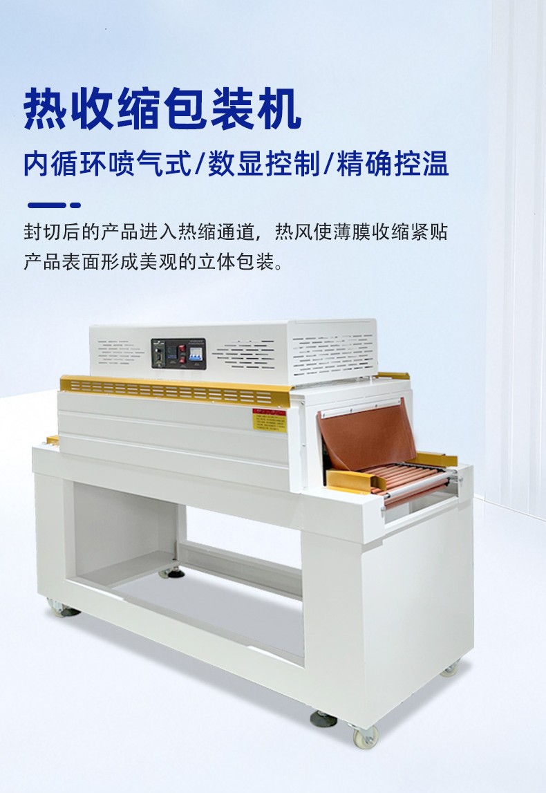 • 工作原理6:通常基于恒溫加熱技術,先將收縮膜加熱至所需溫度,然后對已包裹產品的收縮膜進行熱封切操作,再將完成封切的產品送入收縮爐內加熱,使收縮膜收縮并緊密貼合產品,最后經冷卻得到平整美觀的包裝效果。
