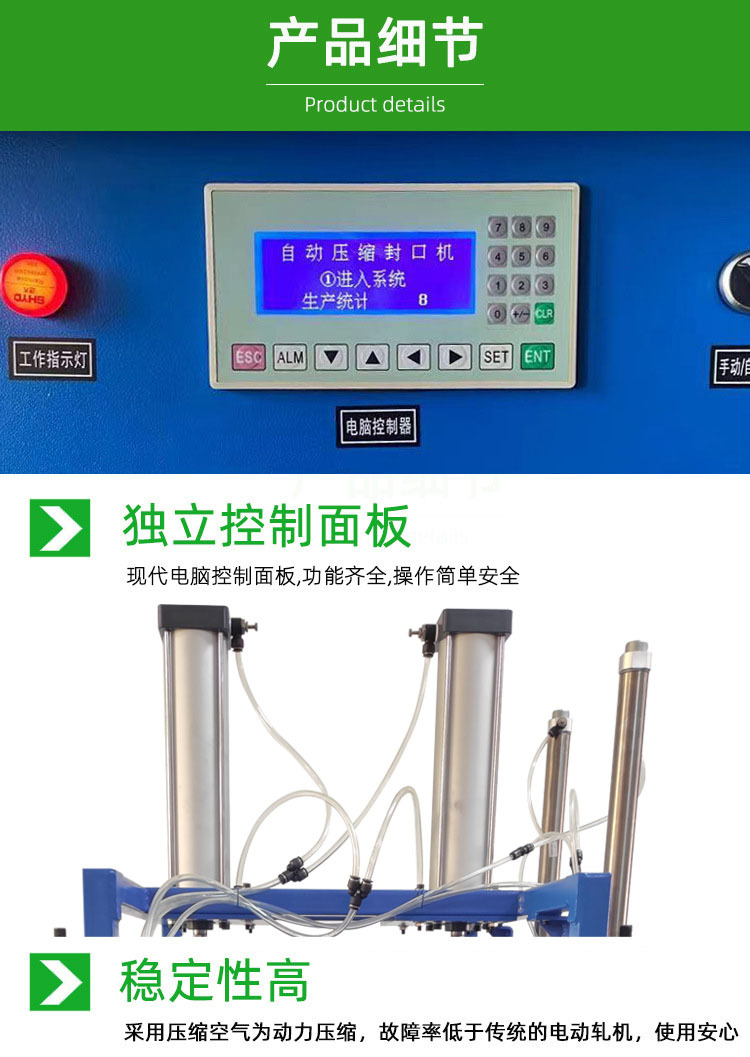 封口壓縮機是一種利用機械壓力將袋口封口成型的設備,主要由上下兩個封口頭和主體結構組成。其技術特點是采用氣動或電動裝置控制封口頭的壓力和溫度,以達到快速封口、高效率、高精度和穩定可靠的效果。